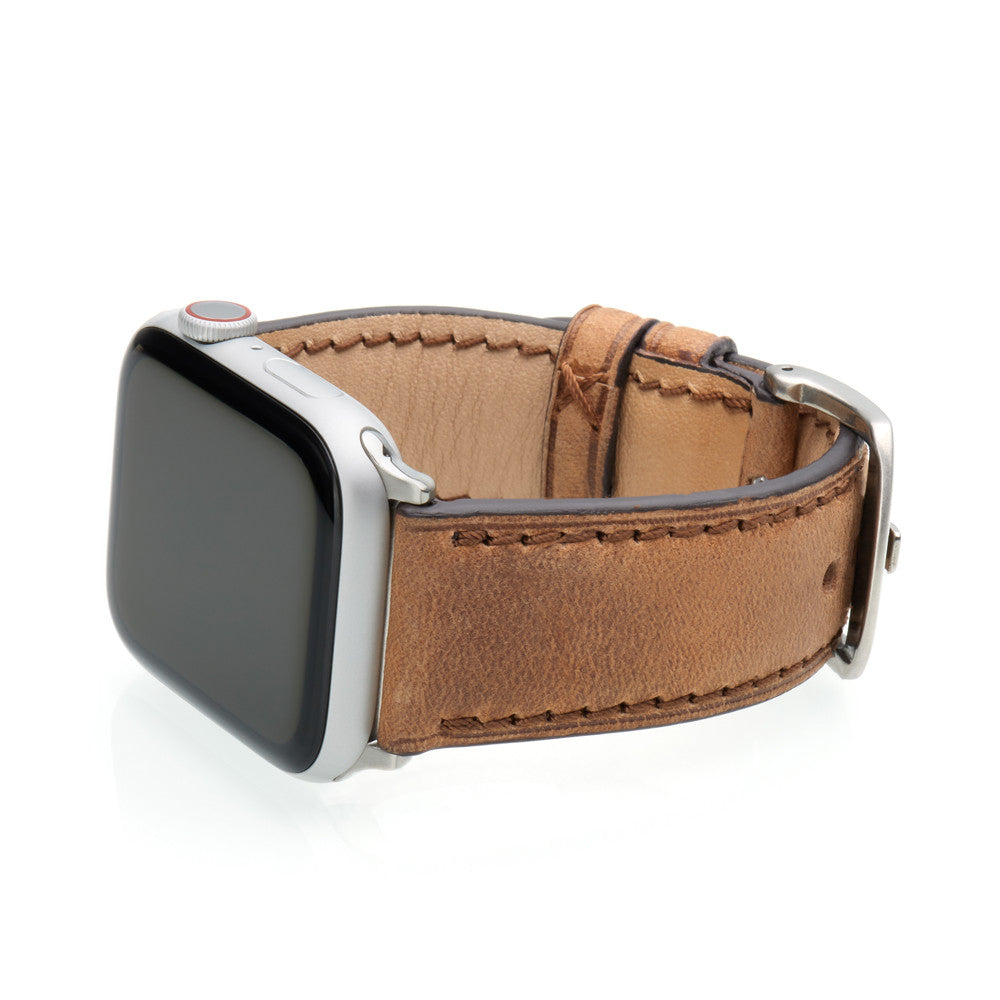The Woodland watch band for Apple Watch is crafted from distressed vintage leather, designed to develop a rich patina over time. The light brown leather naturally darkens with wear, giving each strap a one-of-a-kind look that evolves with every use. Its warm, earthy tone is reminiscent of a well-worn baseball glove and contrasts beautifully against the black face of an Apple Watch.