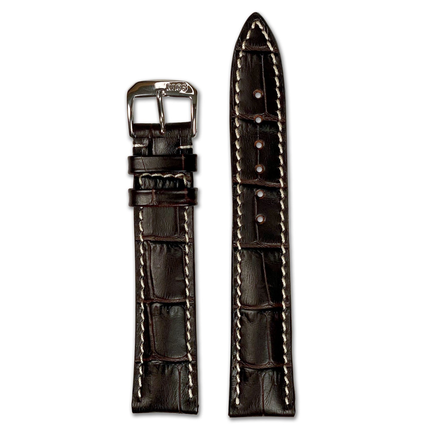 Add refined character to your timepiece with the New Orleans Embossed Leather Alligator Print Watch Band by RIOS1931. Crafted from high-quality cow leather and finished with an embossed alligator grain, this strap delivers the upscale look of exotic leather with everyday durability. Bold white stitching adds a touch of contrast, enhancing the texture and giving the band a modern, tailored feel.