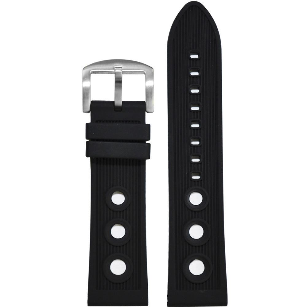 The perforated rally-style design enhances breathability, keeping your wrist cool and comfortable during any activity. A stainless steel buckle closure provides a secure and adjustable fit, while the durable silicone construction ensures long-lasting performance. Available in a variety of colors, this sporty and functional watch band allows you to personalize your watch with a strap that blends racing-inspired style and everyday comfort.